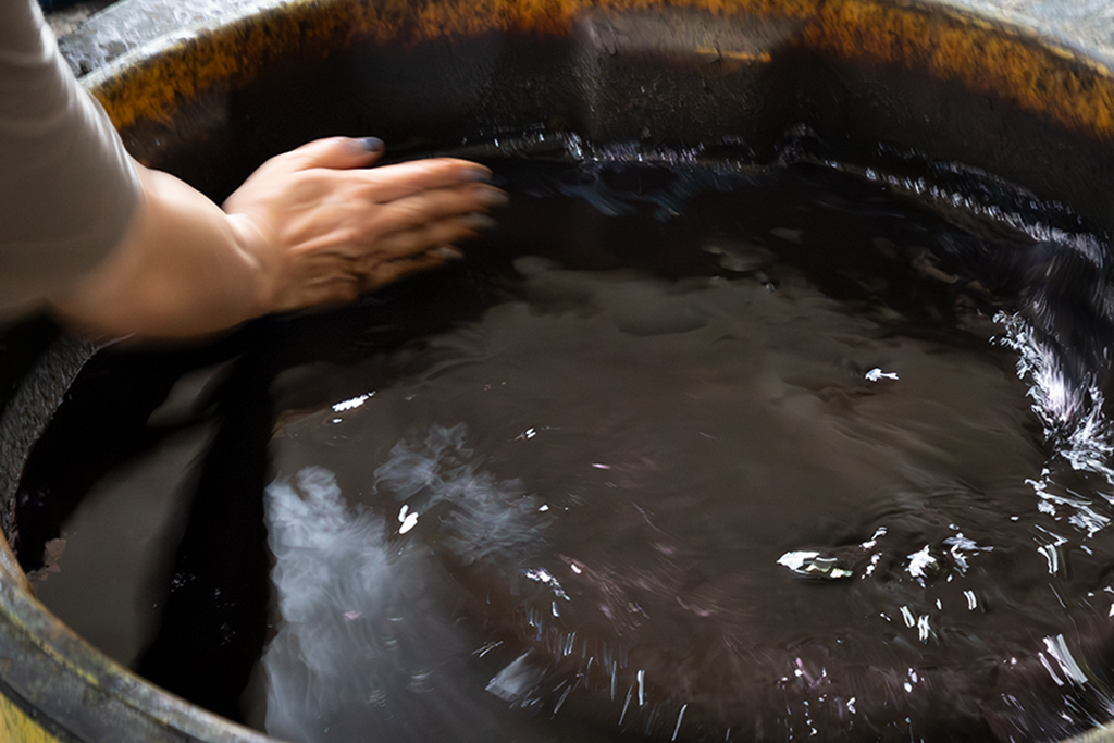 工場でつくられる化学染料は、一定の規格によりつくられるためその染めの力も一定だが、藍の染料の原料となる蒅は、自然の植物からつくられるため、つくられた年によって多少の違いが出る。藍甕に建てられた藍も日々状態が違う。藍の状態、染めるものの状態を見極める経験や感覚を使い、欲しい色にするため藍と一緒に作業をする、まさにLiveだ。