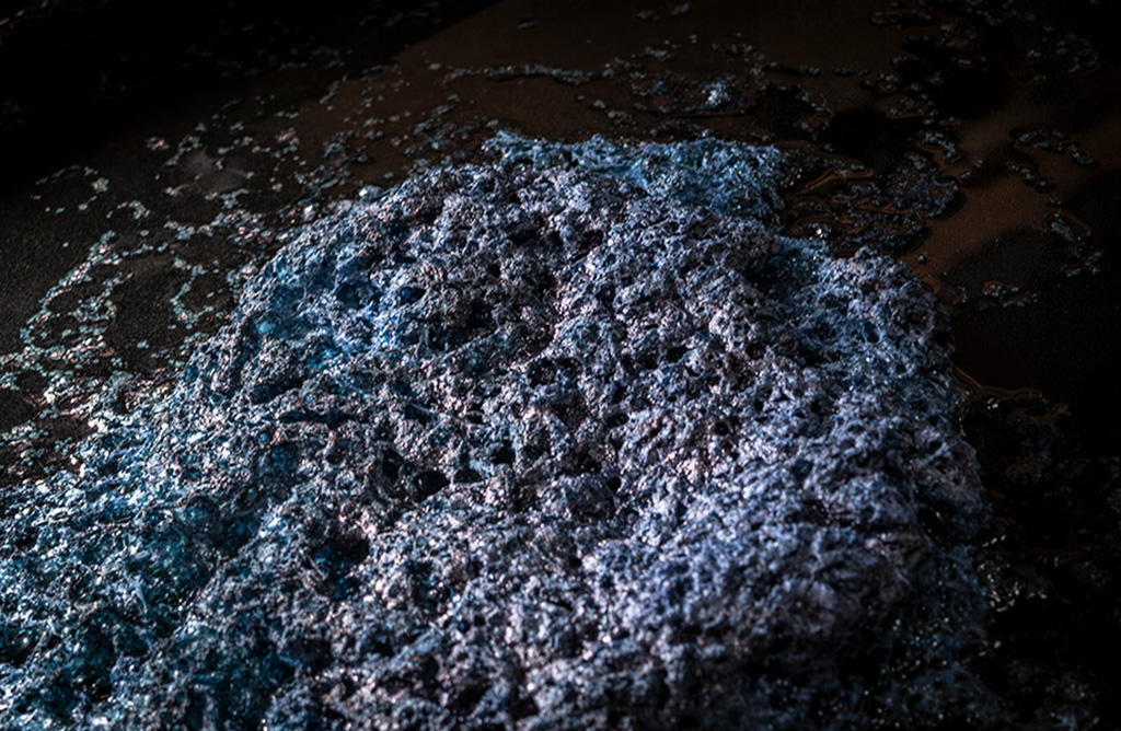 藍染め産業は分業が一般的で、古庄染工場でも、徳島産の蒅を使い発酵させて、藍液をつくる。つくり手によって加える材料にもこだわりを持っている。藍液を掻き混ぜると、液表面に「華」と呼ばれるきめ細やかな泡が生まれる。つくり手は、藍液のことを相棒や我が子のように呼ぶ。「既製品がないから、コーナンで材料を買ってきて手づくりしたんよ」発酵建てを終えて、美智子さんが愛用の道具を見せてくれた。こんな重い道具を自在に操りつくった「華」は、美しく怪しげな色を放つ。「藍には全部の色が入っているから(人は)惹きつけられるんよ」と先生は言う。